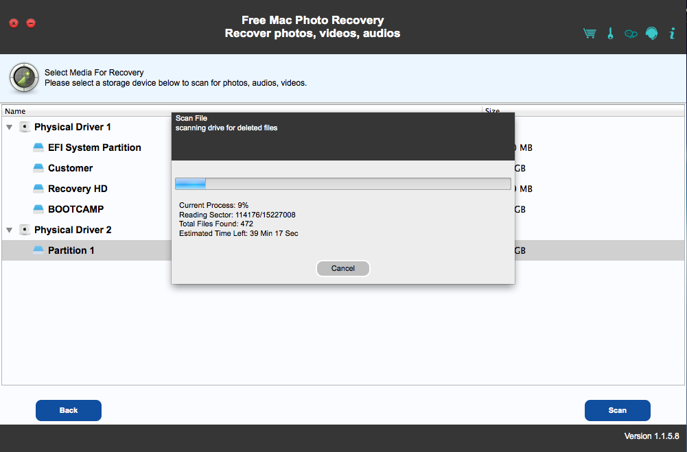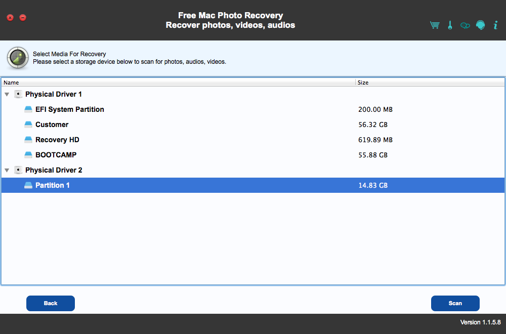 Choose the file types you want to recover and click the "Scan" button , then select your target storage device in the drive list. Then click the "Scan" button to scan for deleted or formatted photos, videos, audios, and any other documents.
