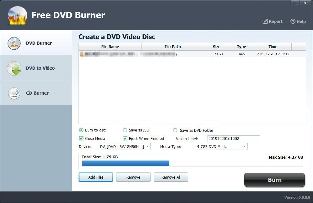 Select the right DVD drive from Device drop-down list, choose "Burn to Disc" and click "Add Files" to load video files. Click "Burn" button to start burning DVD.