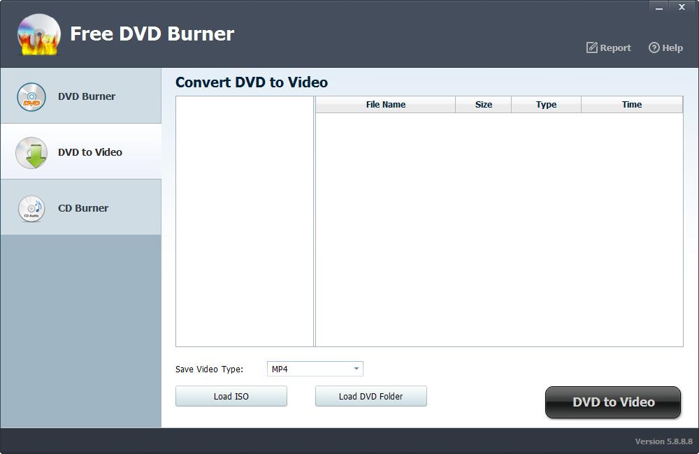 Click "DVD to Video" from the left of the main interface, you can load ISO file or load DVD folder, select output video format from "Save Video Type drop-down list and then click "DVD to Video" button to start ripping DVD.