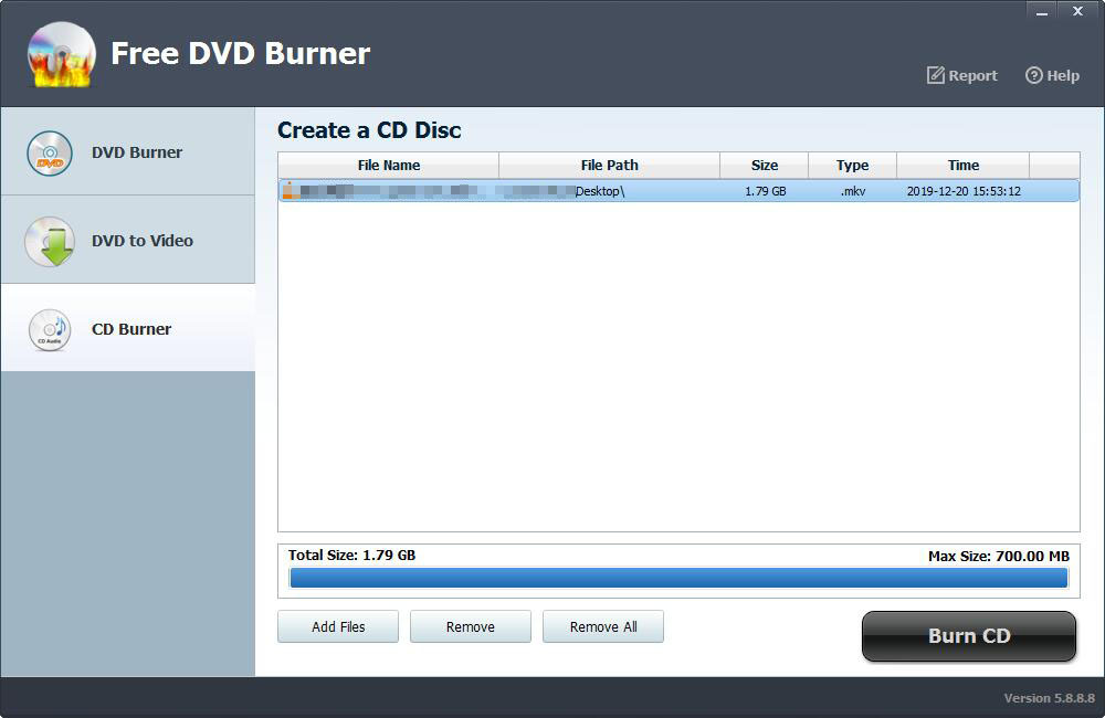 Click "CD Burner" from the left of the main interface, click "Add Files" to load music files. Click "Burn CD" button to start burning CD.